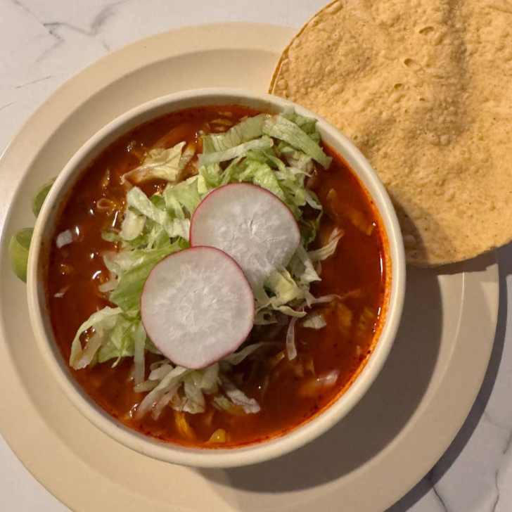 Pozole rojo con carne a elegir acompañado de lechuga, cebolla, limonesy rabanos.