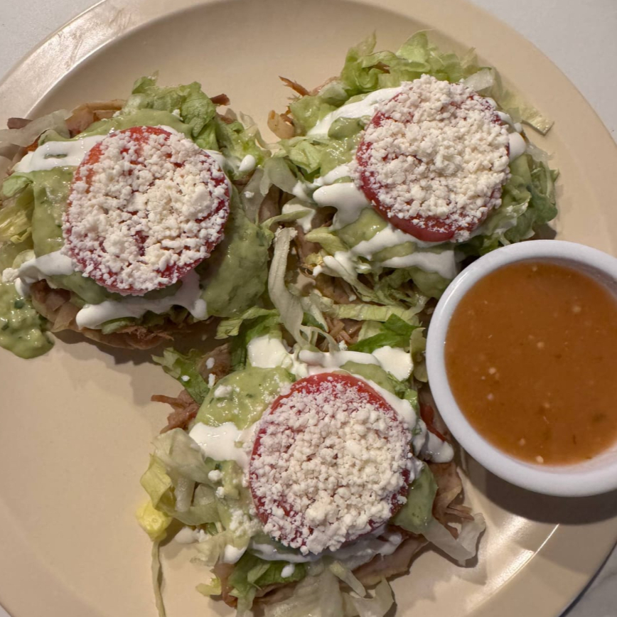 Orden de 3 sopes con frijoles, lechuga crema, queso y salsa.