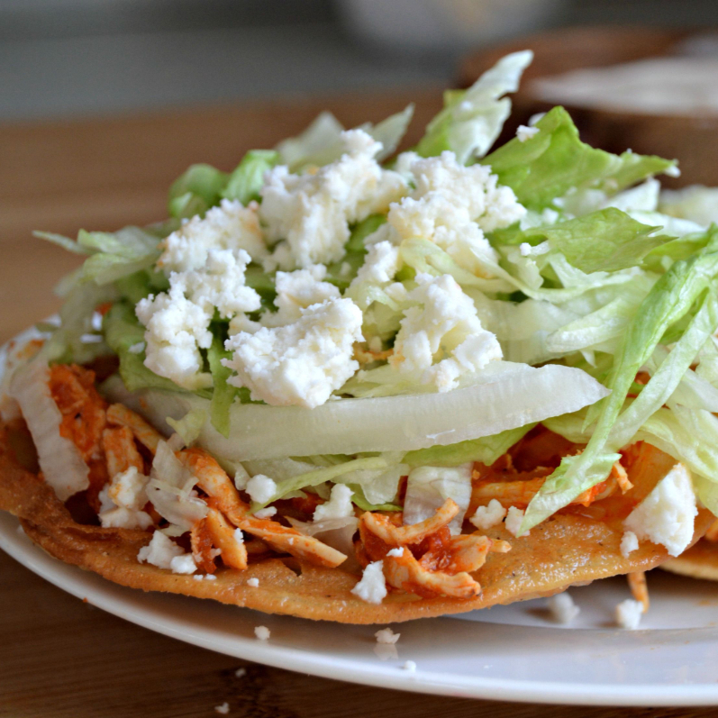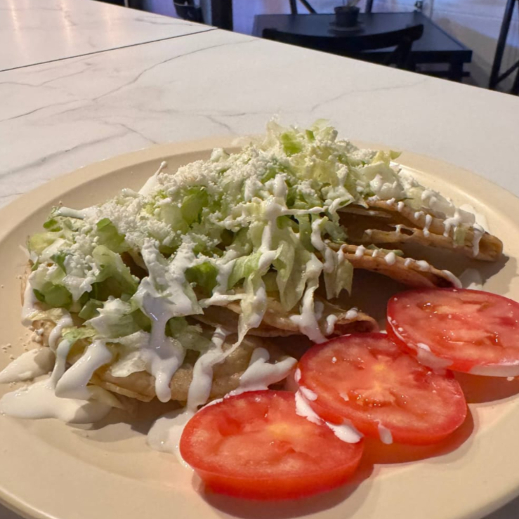 Orden de 3 tostadas con el relleno de su elección, acompañado de frijoles, lechuga, queso, crema y salsa.