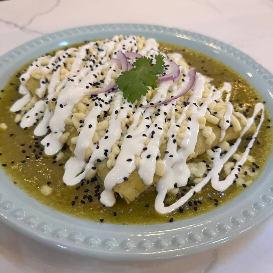 Orden de 4 enchiladas rellenas de pollo bañadas en nuestra salsa verde, acompañado de queso y crema.