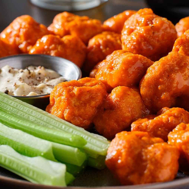Crujientes bañados en salsa búfalo con el picante defecto que te hace querer otro