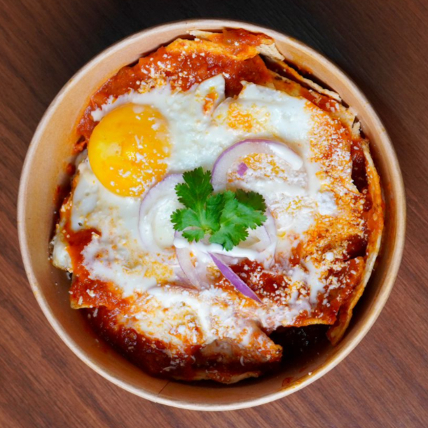 Totopos de maíz bañados en salsa (roja o verde) con queso, crema, cebolla y frijoles refritos. ¡Un desayuno que te da energía!.