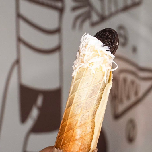 Marquesita rellena de queso crema, con tu topping a elegir y una bola de nieve de vainilla. ¡El contraste perfecto!.