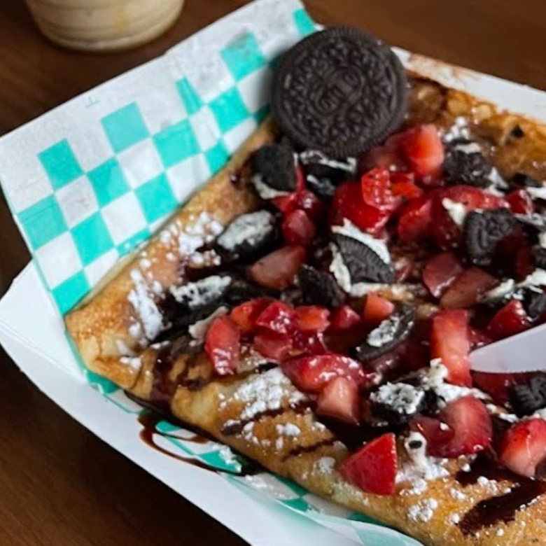 Crepa para los amantes del chocolate, rellena de Nutella (crema de avellanas), galleta Oreo, queso crema y fruta a elegir.
