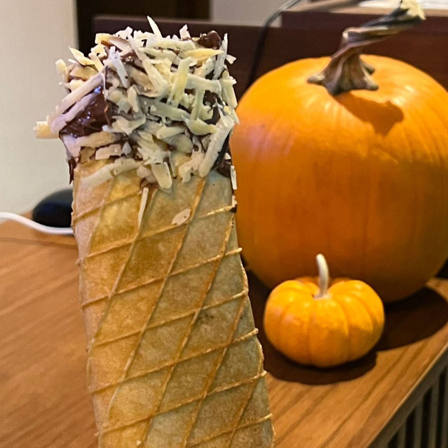 Marquesita rellena de queso, rebanadas de pepperoni y salsa de tomate.