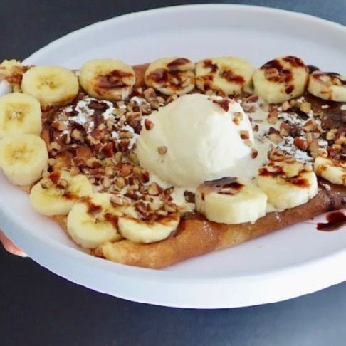 Crepa rellena de Nutella (crema de avellanas), plátano, queso y coronada con una bola de nieve. ¡Un clásico delicioso!.