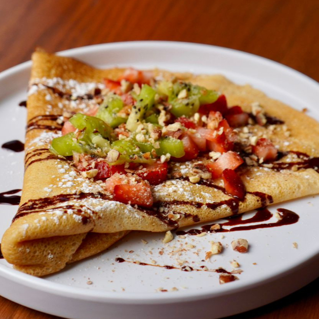 Crepa dulce rellena de fresa y kiwi, queso crema, nuez y crema batida.