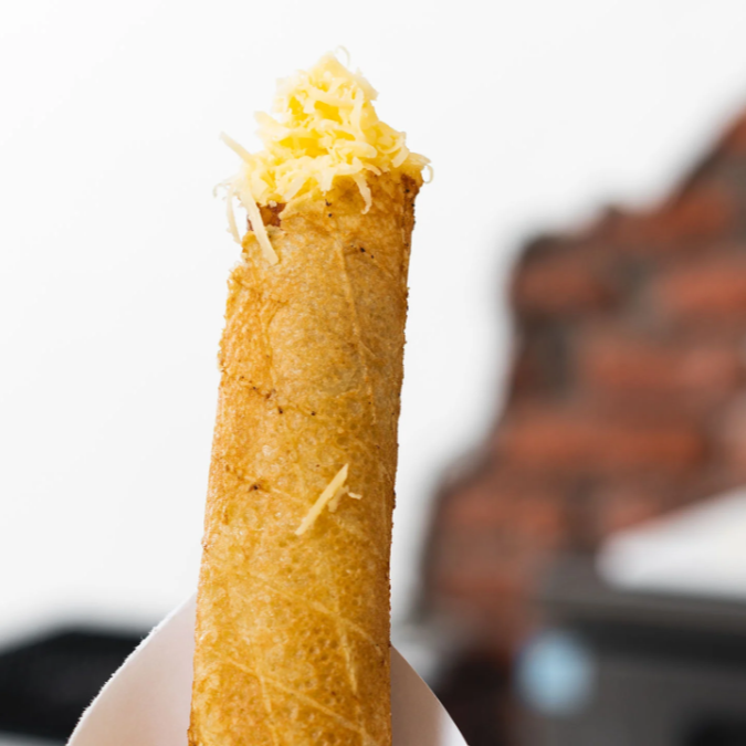 Marquesita rellena de queso bola, fruta de temporada y un toque de leche condensada (Lechera).