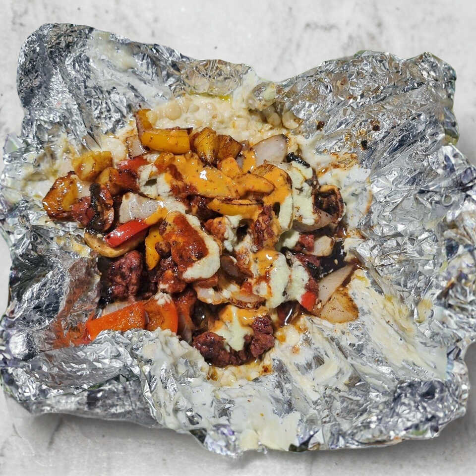 Chips moradas bien crujientes mezclados con granos de elote, bañados en queso amarillo, mayonesa y tus toppings favoritos.