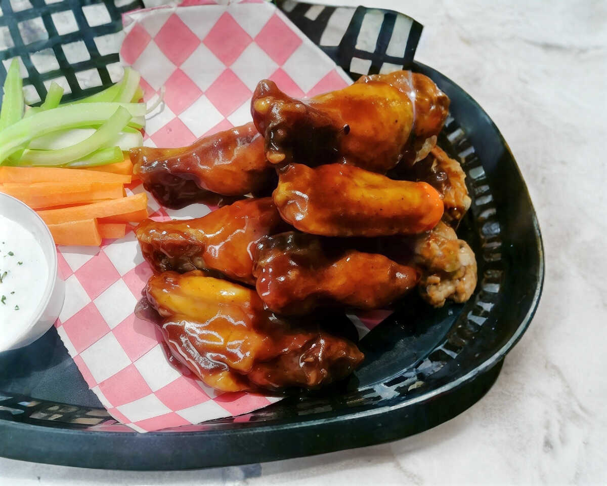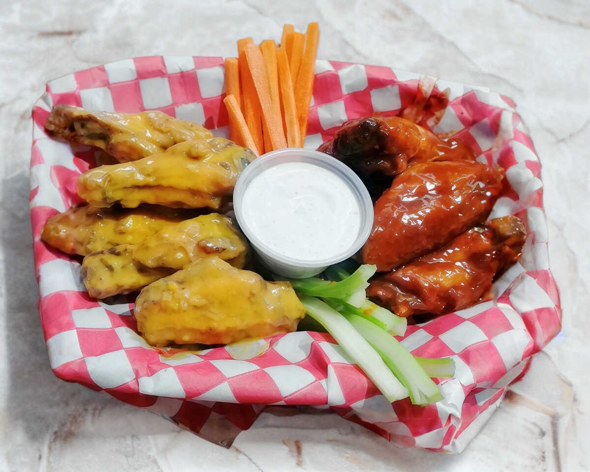 6 Pzas de alitas bañadas en salsa de tu preferencia y acompañado de aderezo ranch y verduras.