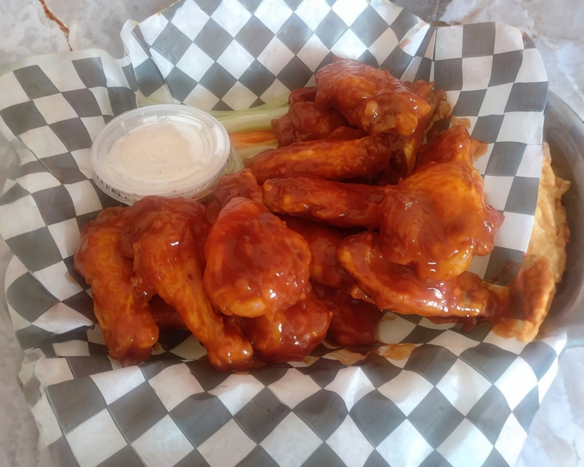 10 Pzas de alitas bañadas en salsa de tu preferencia y acompañado de aderezo ranch y verduras.