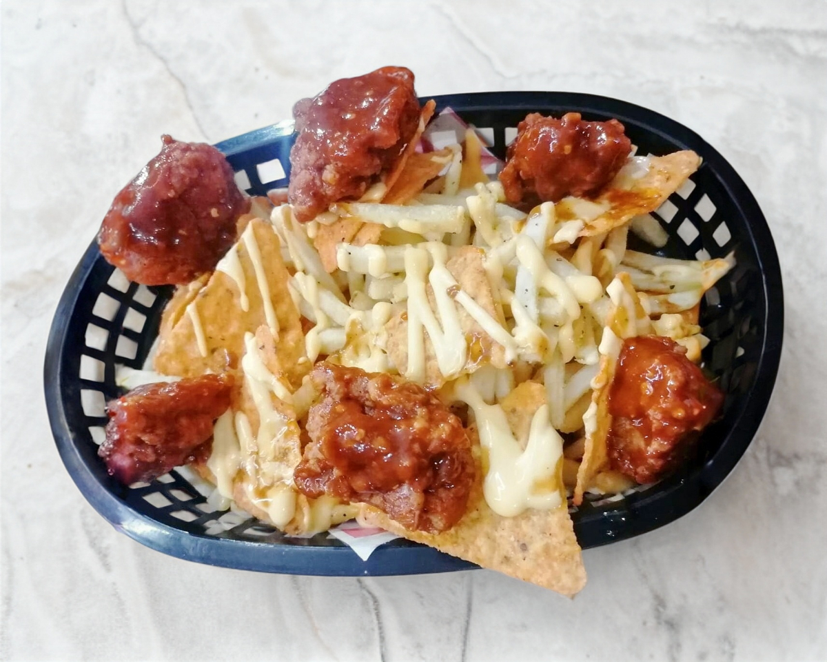 Deliciosas papas a la francesa con doritos, queso amarillo y jalapeños, más 6 pzas de boneles o alitas bañadas en cualquiera de nuestras salsas.