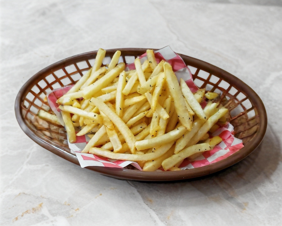 240 grs de papa francesa cubierto con queso amarillo , aderezo rancha , y nuestra salsa brava de casa picosa acidita y trozos de crujiente tocino