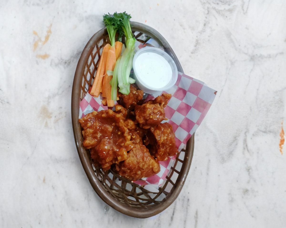 6 Pzas de boneles bañadas en salsa de tu preferencia y acompañado de aderezo ranch y verduras.
