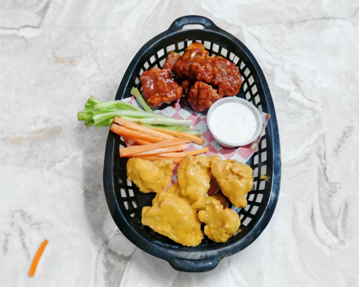 10 Pzas de boneles bañadas en salsa de tu preferencia y acompañado de aderezo ranch y verduras.