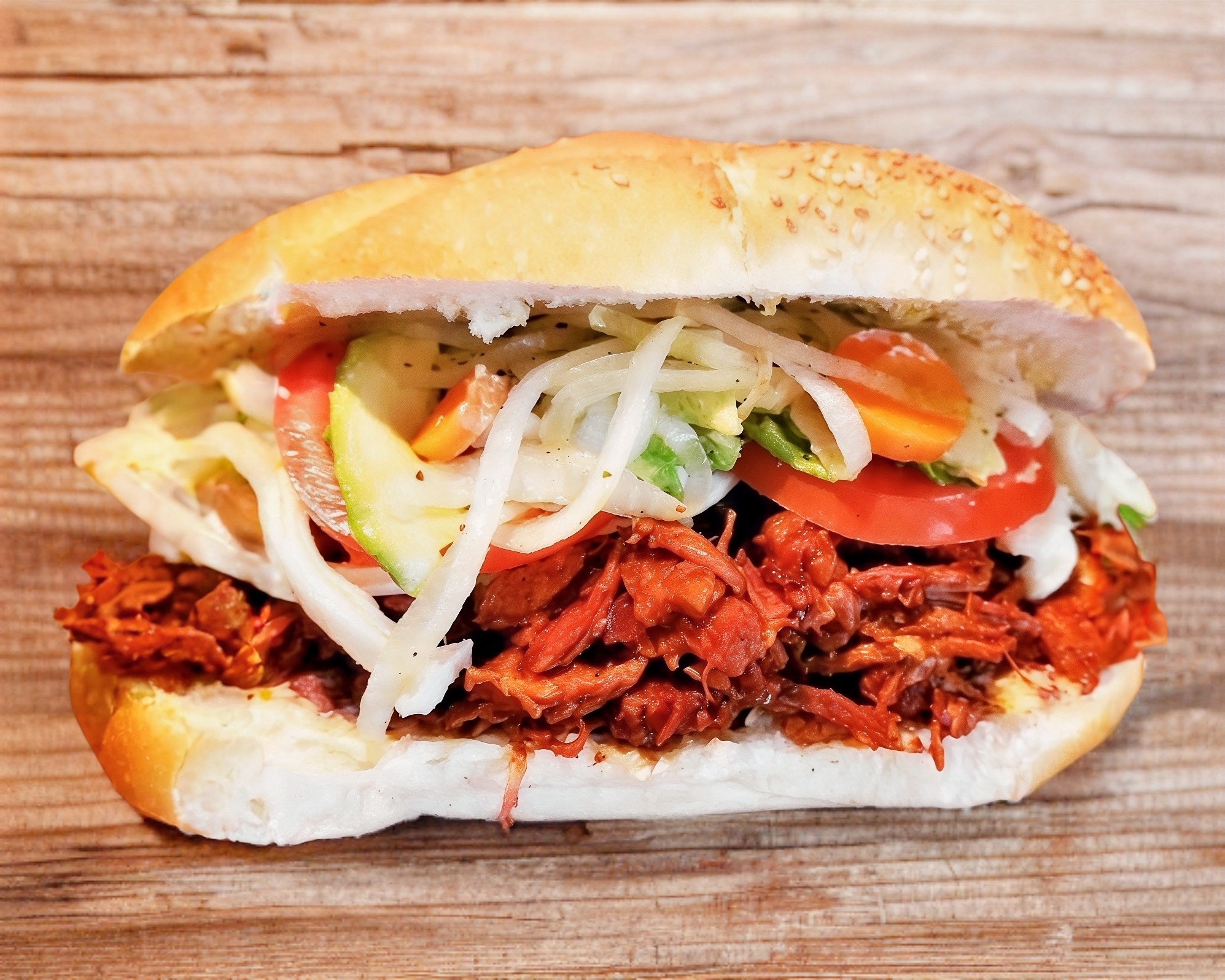 Bolillo del dia con adobada y costra de queso, lechuga. jitomate, cebolla, aguacate, mayonesa.