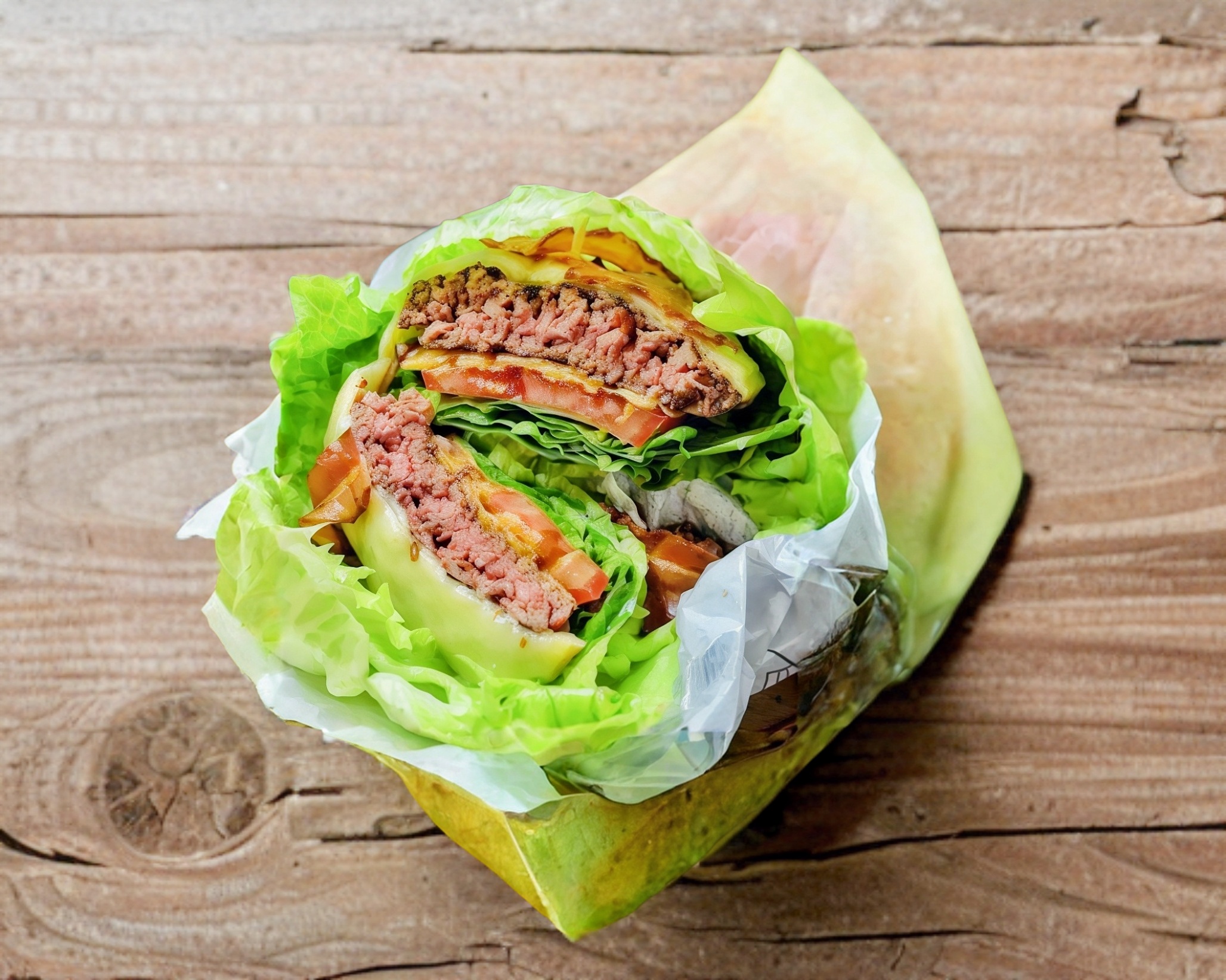 Hamburguesa con carde de res, jitomate, pepino, espinacas, cebolla, aguacate, y unas tapas de lechuga.