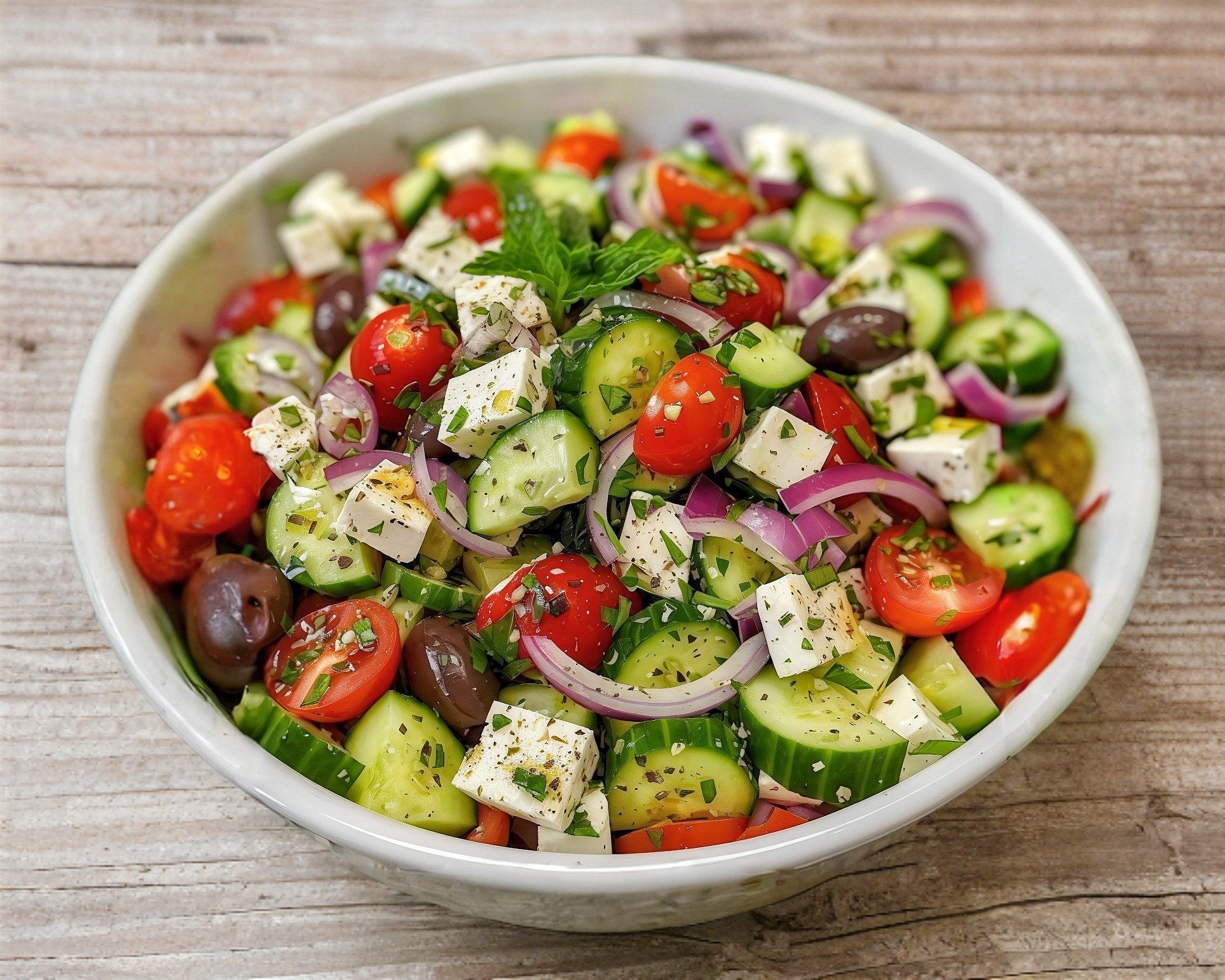 Mezcla de lechugas, pepino, jitomate, queso panela, crotones, y aderezo ranch