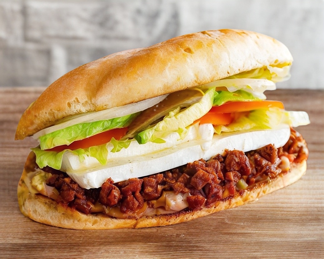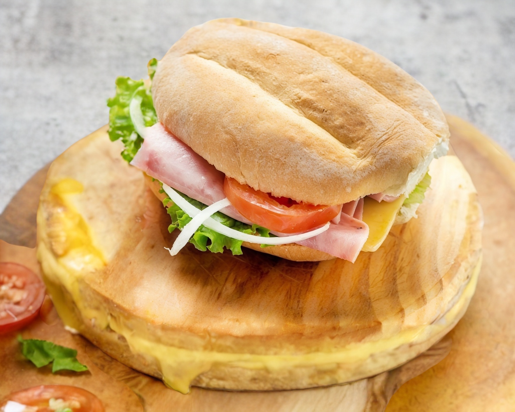Bolillo del día con salchicha, jamón, chorizoqueso, lechuga. jitomate, pepino, cebolla, aguacate, mayonesa.