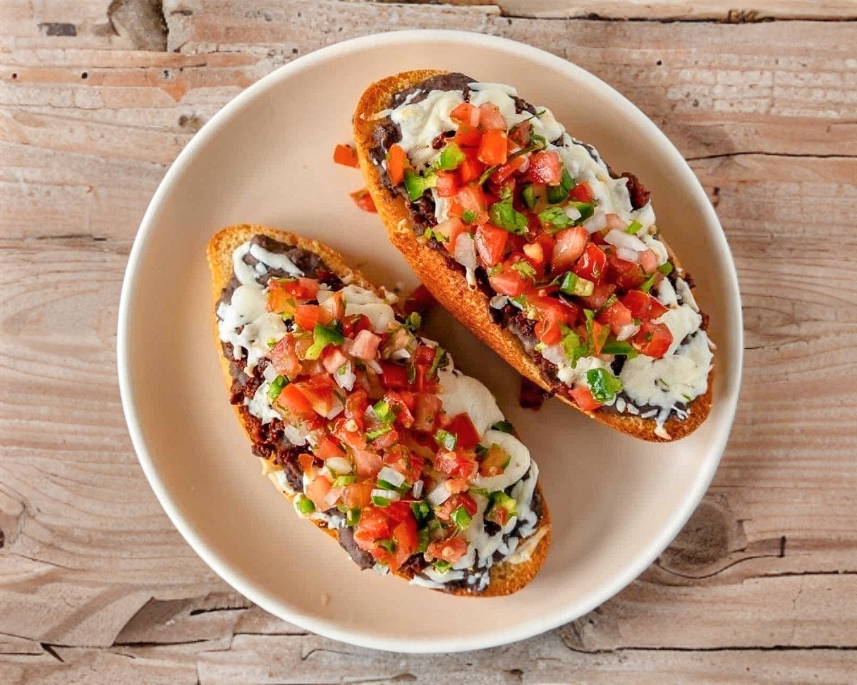 Bolillo con frijoles refritos y cubierto con queso gratinado, acompañado de pico de gallo,