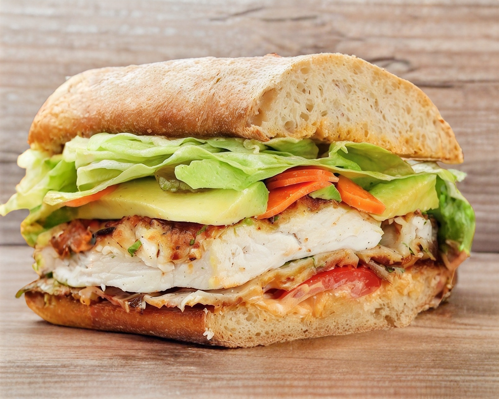 Bolillo del dia con milanesa de pollo, lechuga. jitomate, cebolla, aguacate, mayonesa, y queso amarillo