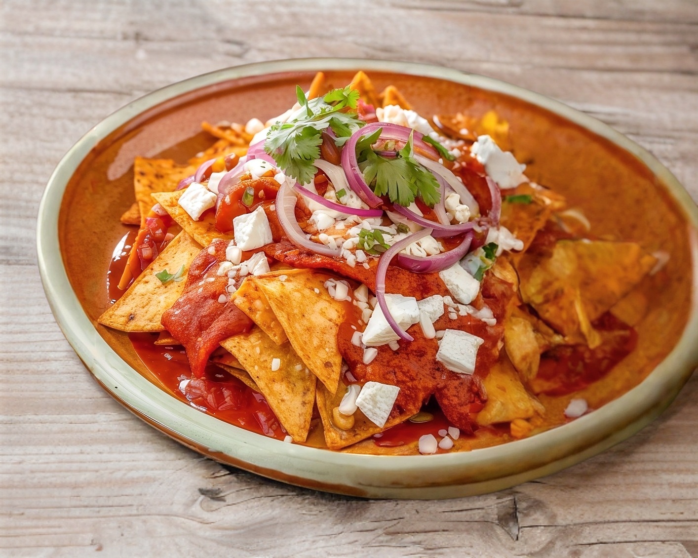 Tortilla de maíz bañada con salsa verde, con pollo, crema, cebolla y queso. Acompañados con una porción de frijoles refritos y bolillo