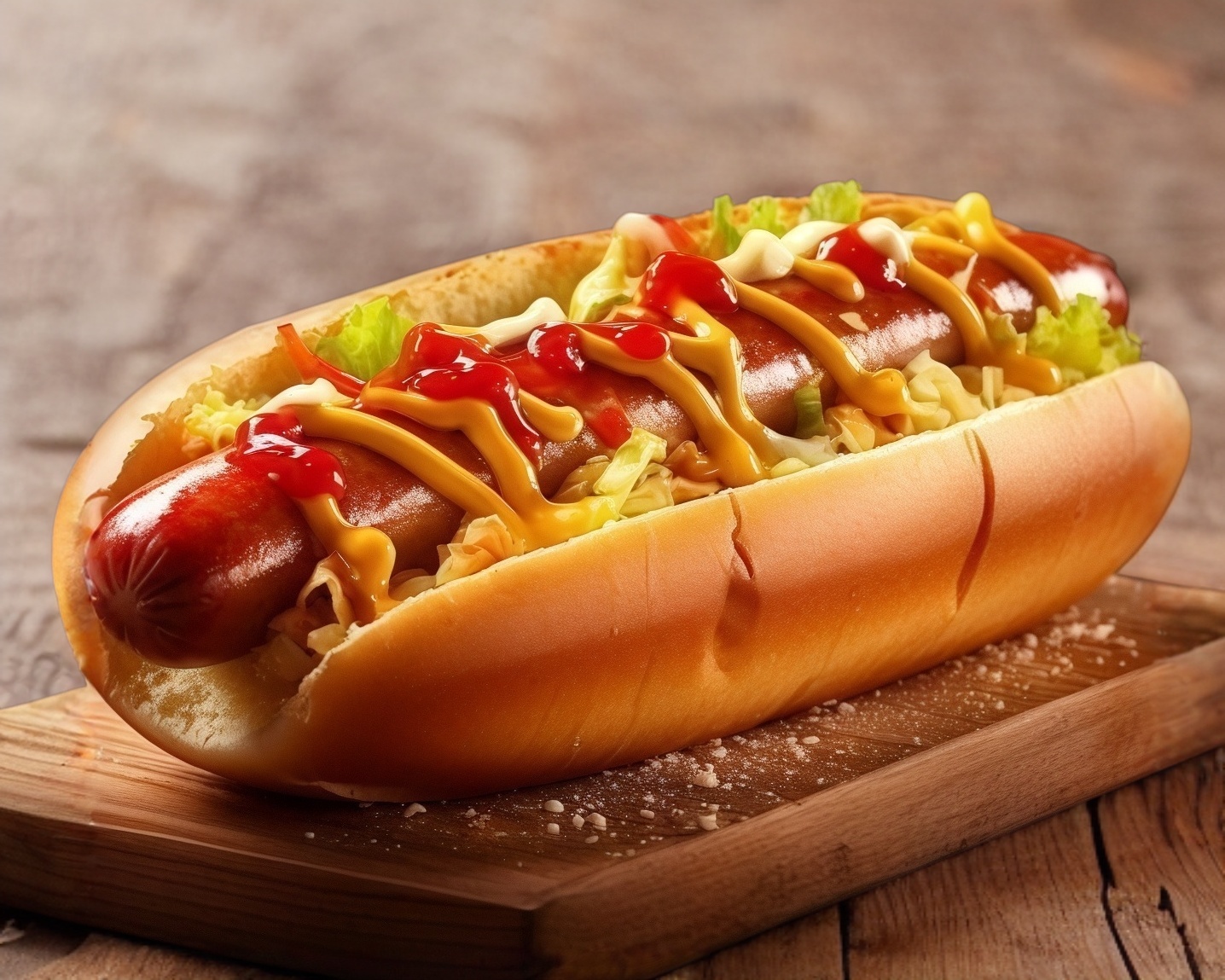 Hot dog preparado con salchicha de pavo, con aderezos y cebolla caramelizada, jitomate en cubos.