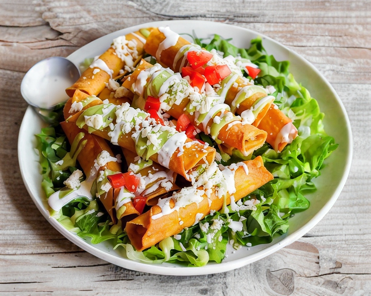 5 piezas de flautas rellanas de pollo, acompañadas con crema, queso, pico de gallo y lechuga, y salsa.