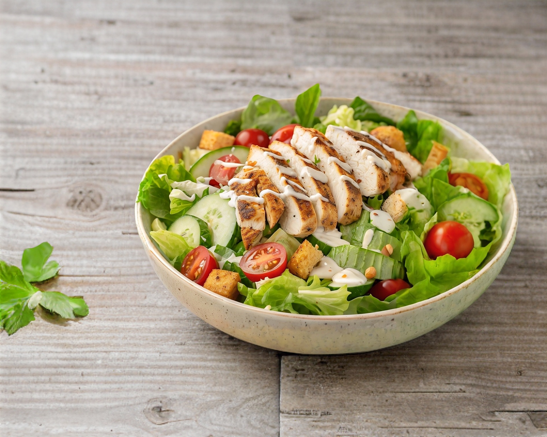 Mezcla de lechugas, espinacas, pepino, jitomate, con pollo a la plancha, crotones, y aderezo ranch