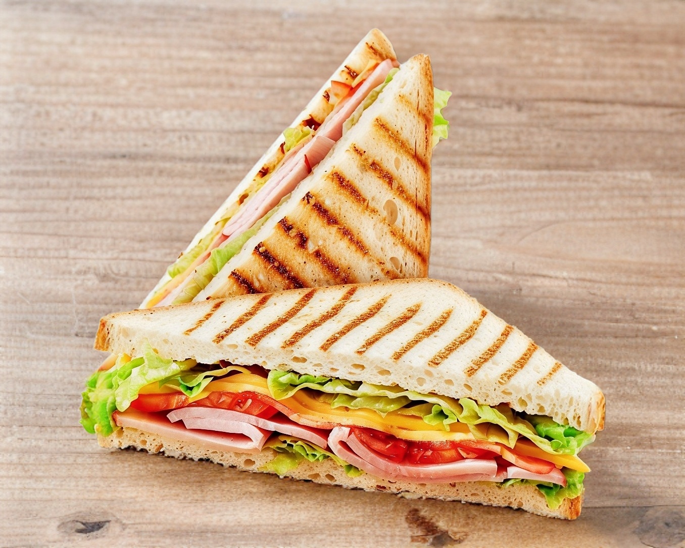 Sandwich de jamón acompañado de queso, lechuga, jitomate , cebolla, pepino, aguacate