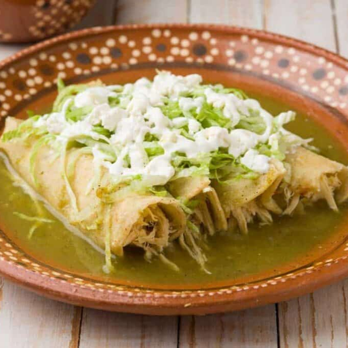 5 pzas de enchiladas verdes bañadas en nuestra salsa de la casa acompañadas de lechuga, crema y queso rayado.