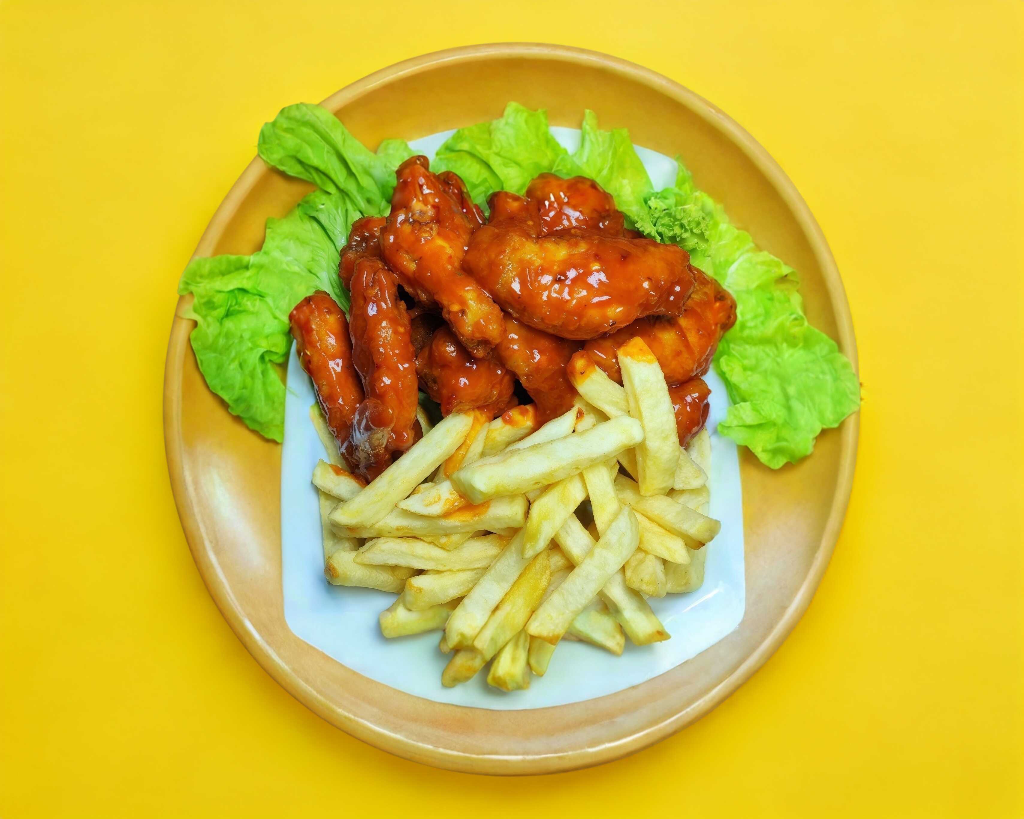 1/2 kg (peso en crudo) de alitas fritas naturales con aderezo y salsa a elegir.