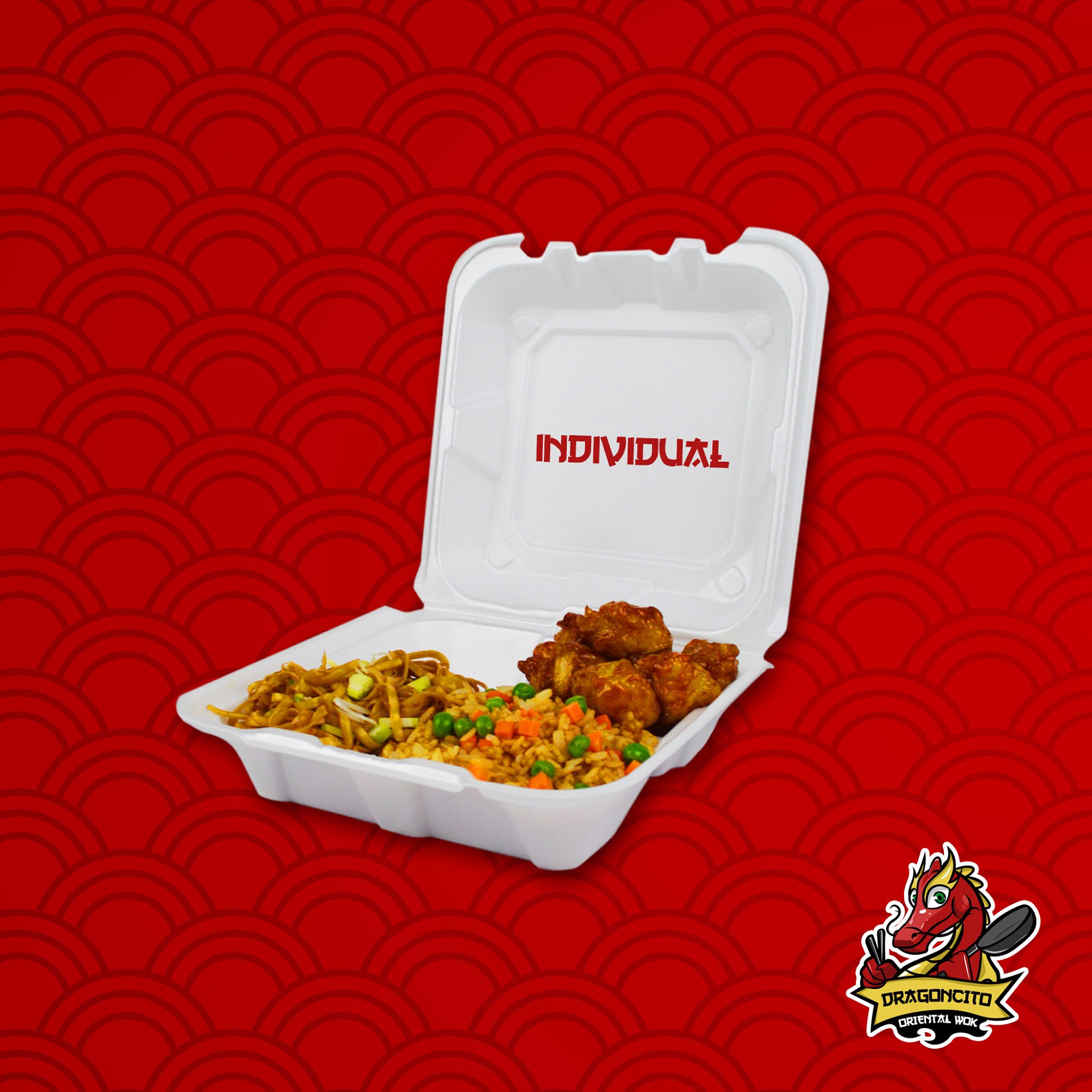 Caja de 26 oz, incluye 1 guisado, 1 complemento, un rollo vegetal o crab dragon y una bebida a elegir.
