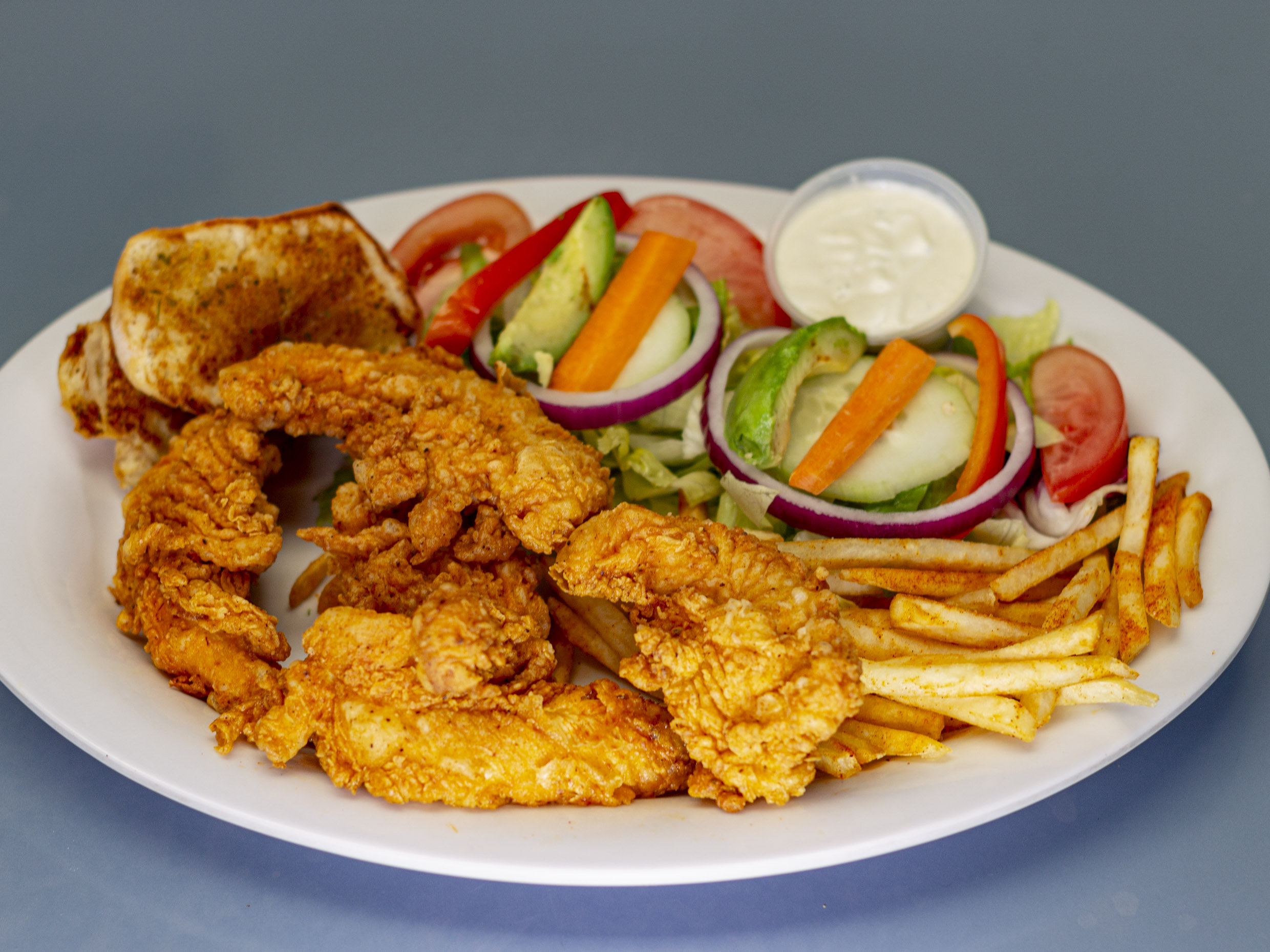 5 Tiras de pollo empanizado, papas, ensalada, aderezo y pan de ajo.