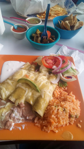 Lleva chiles, morrón, jitomate, cebolla, crema y queso. Frijoles, arroz y salsas.