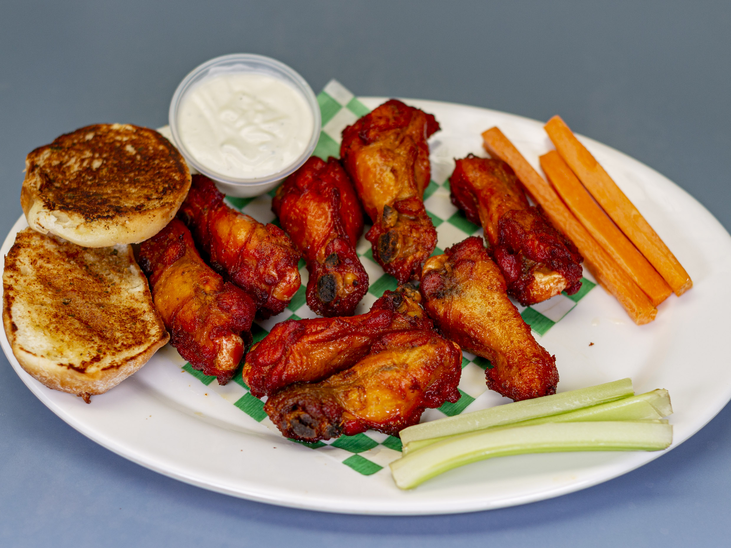 8 Alitas con pan y aderezo.