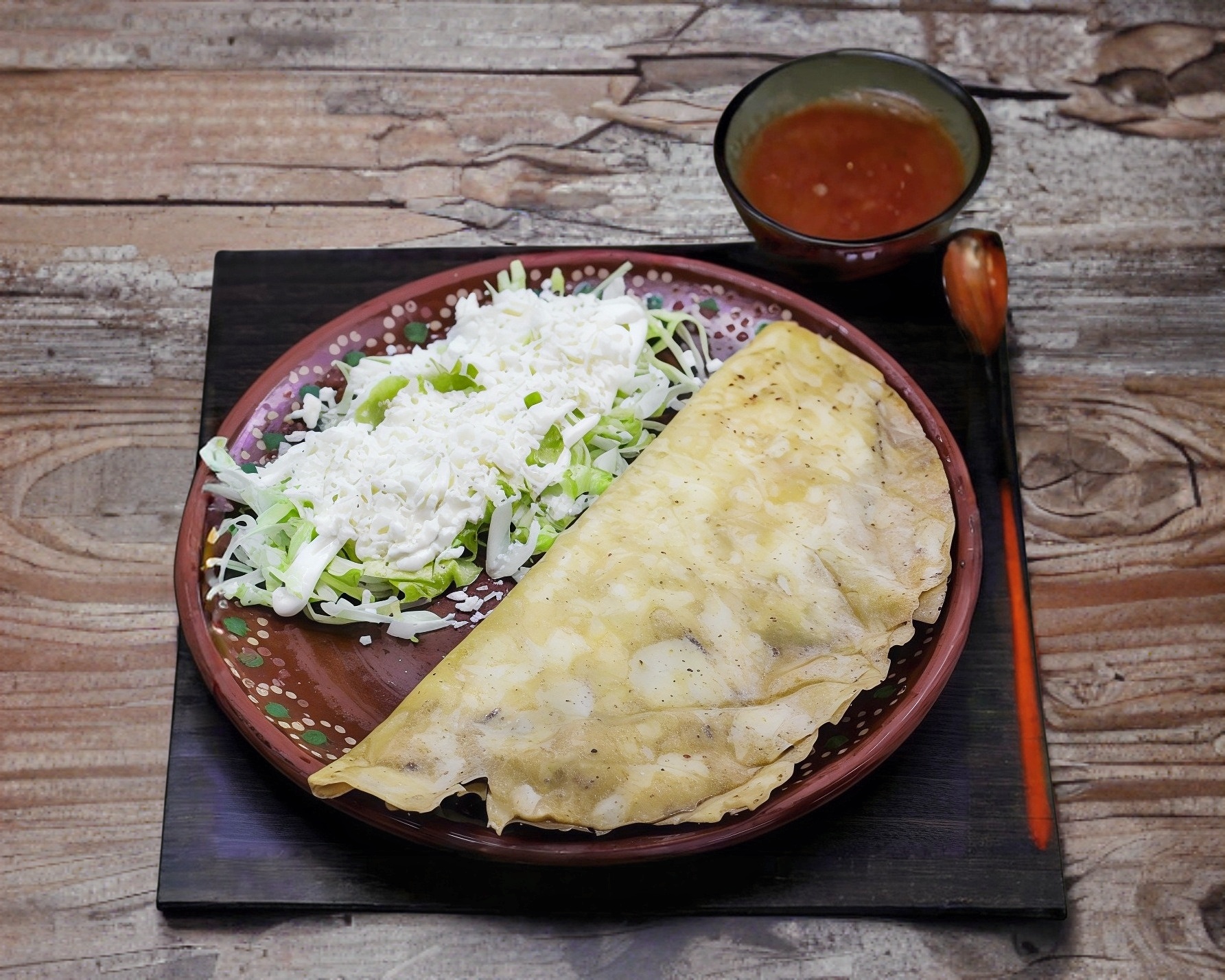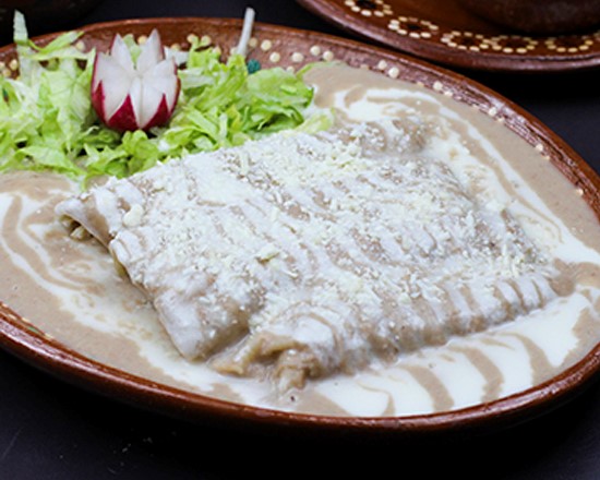 Orden de 4 Piezas. Rellenas de carne de cerdo o rajas. Con lechuga, salsa de jitomate, crema y queso. Incluyen guarnición de guacamole y frijoles.
