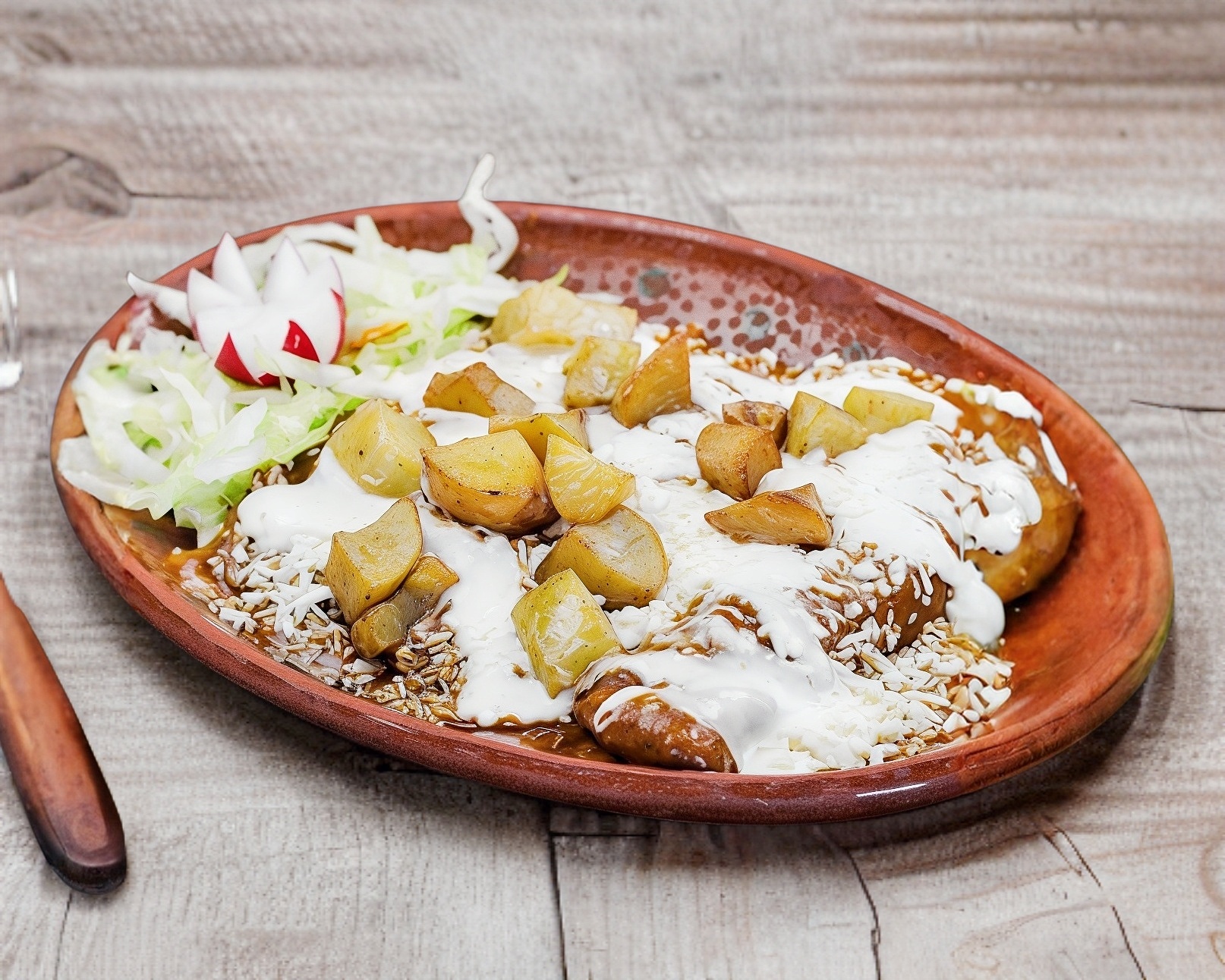 Rellenas de papa, cubiertos con lechuga, salsa de jitomate, crema y queso.
