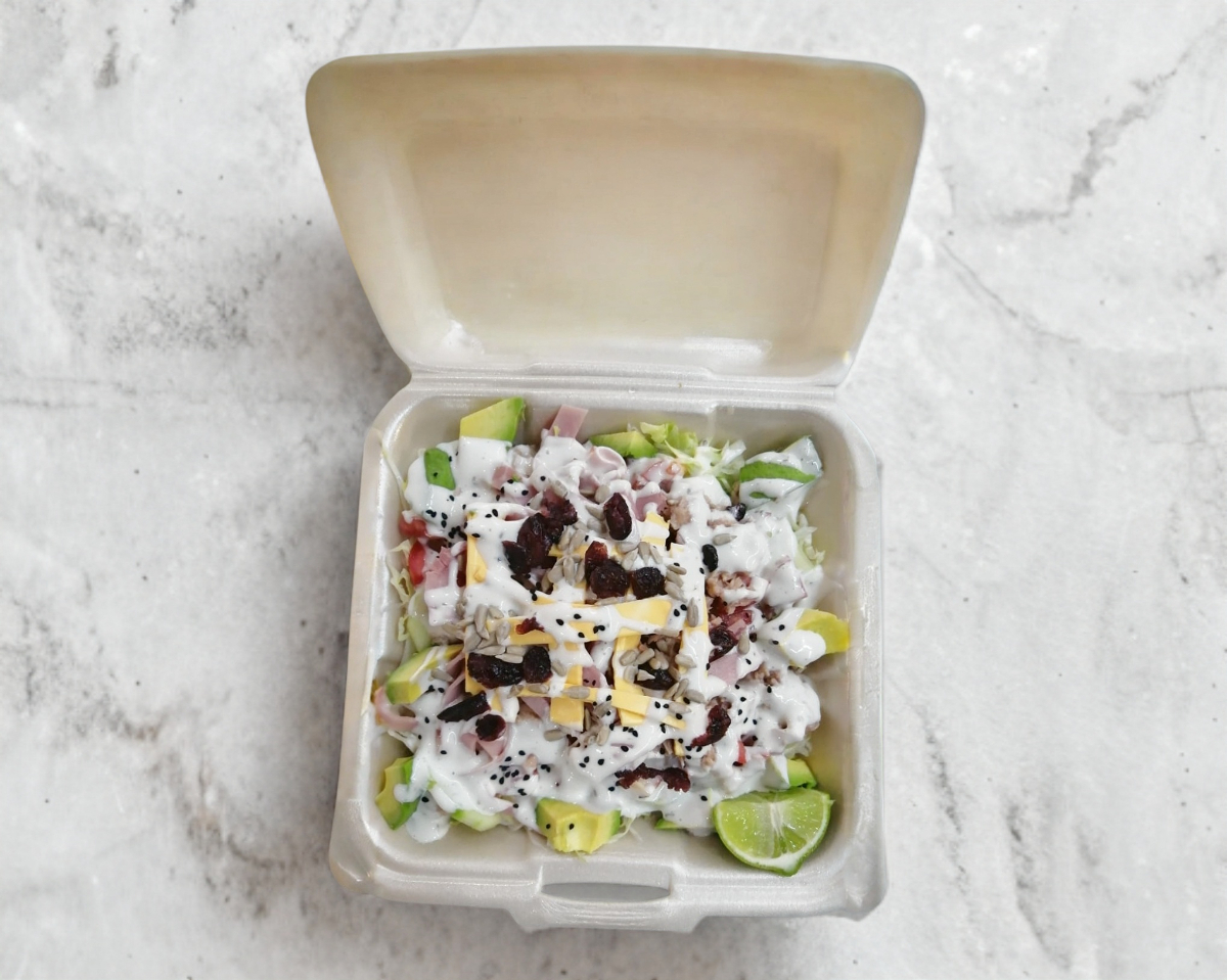 Champiñones, pimiento, jitomate cherry, espinacas, lechuga, arándano, jícama, zanahoria, jamón, aderezo ranch y crotones ,