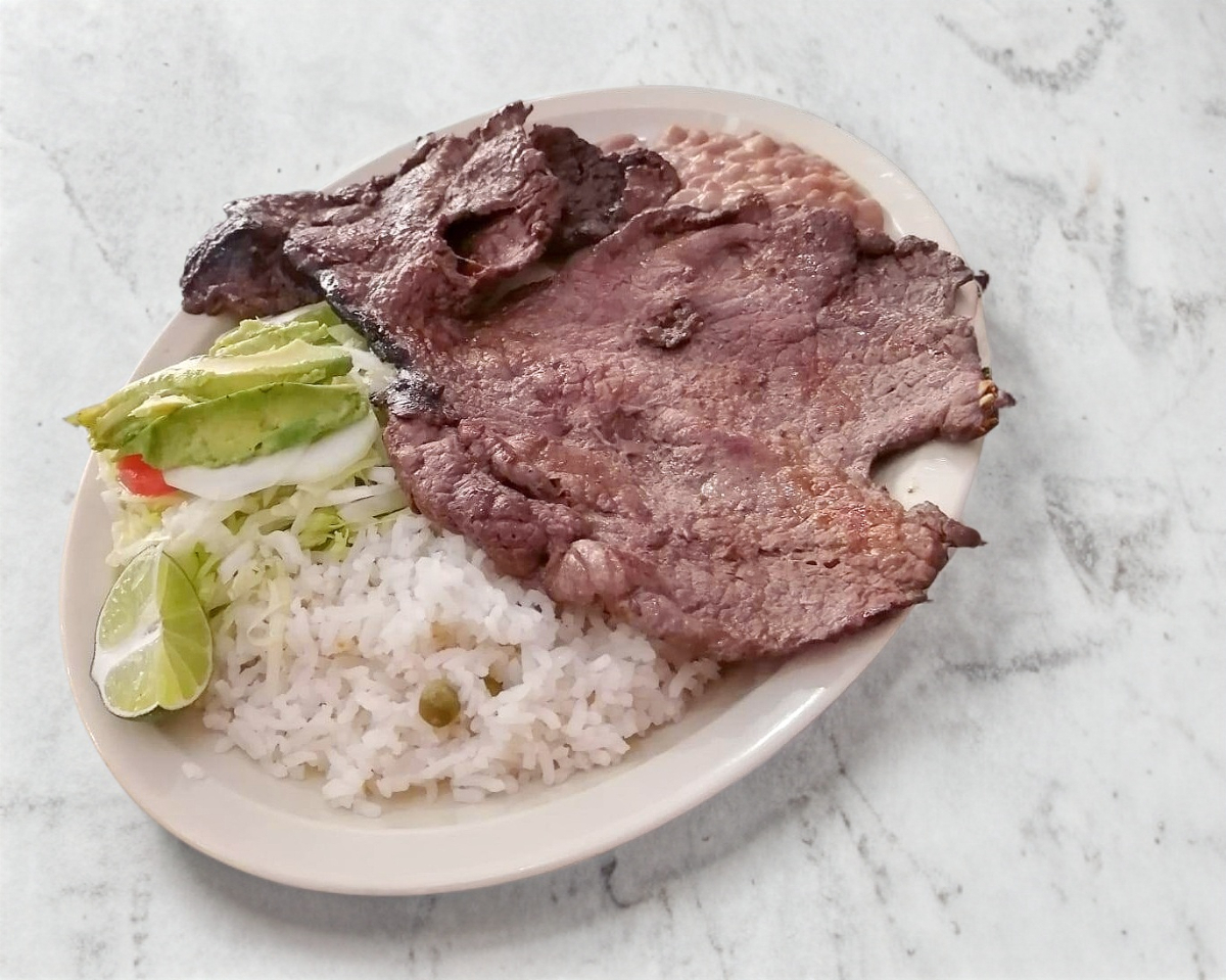 Carne asada con 2 enchiladas verdes, chorizo y queso acompañada de arroz y frijoles.