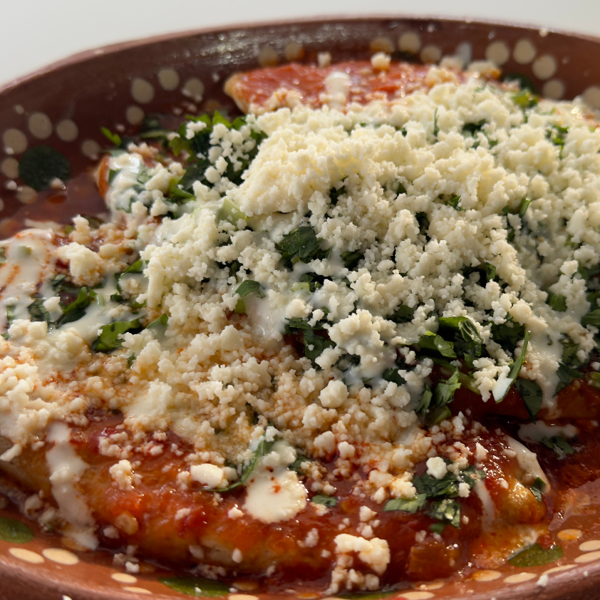 4 Enchiladas cubiertas con salsa cremosa, rellenas de pollo con queso derretido