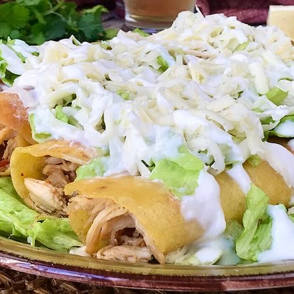 4 Tacos rellenos de tu ingrediente favorito, cubiertos de salsa con lechuga queso y crema