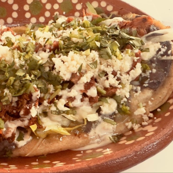 Huarache cubierto de frijoles, salsa, nopales, queso y crema