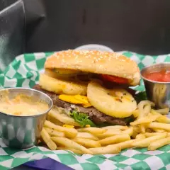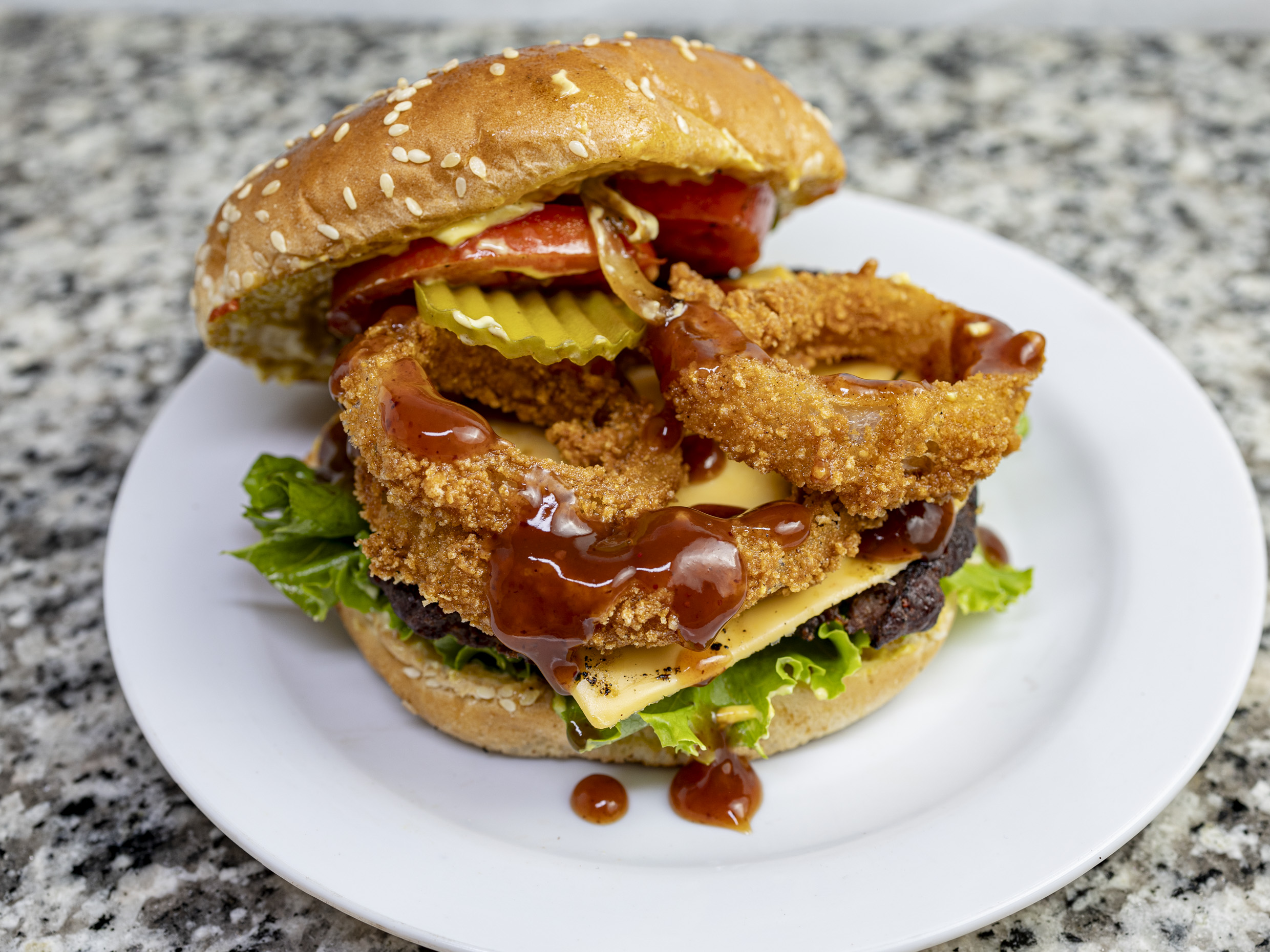 Hamburguesa con aros de cebolla y salsa BBQ, lleva su carne de hamburguesa, pepinillos, jitomate, cebolla, lechuga, aderezos y queso.