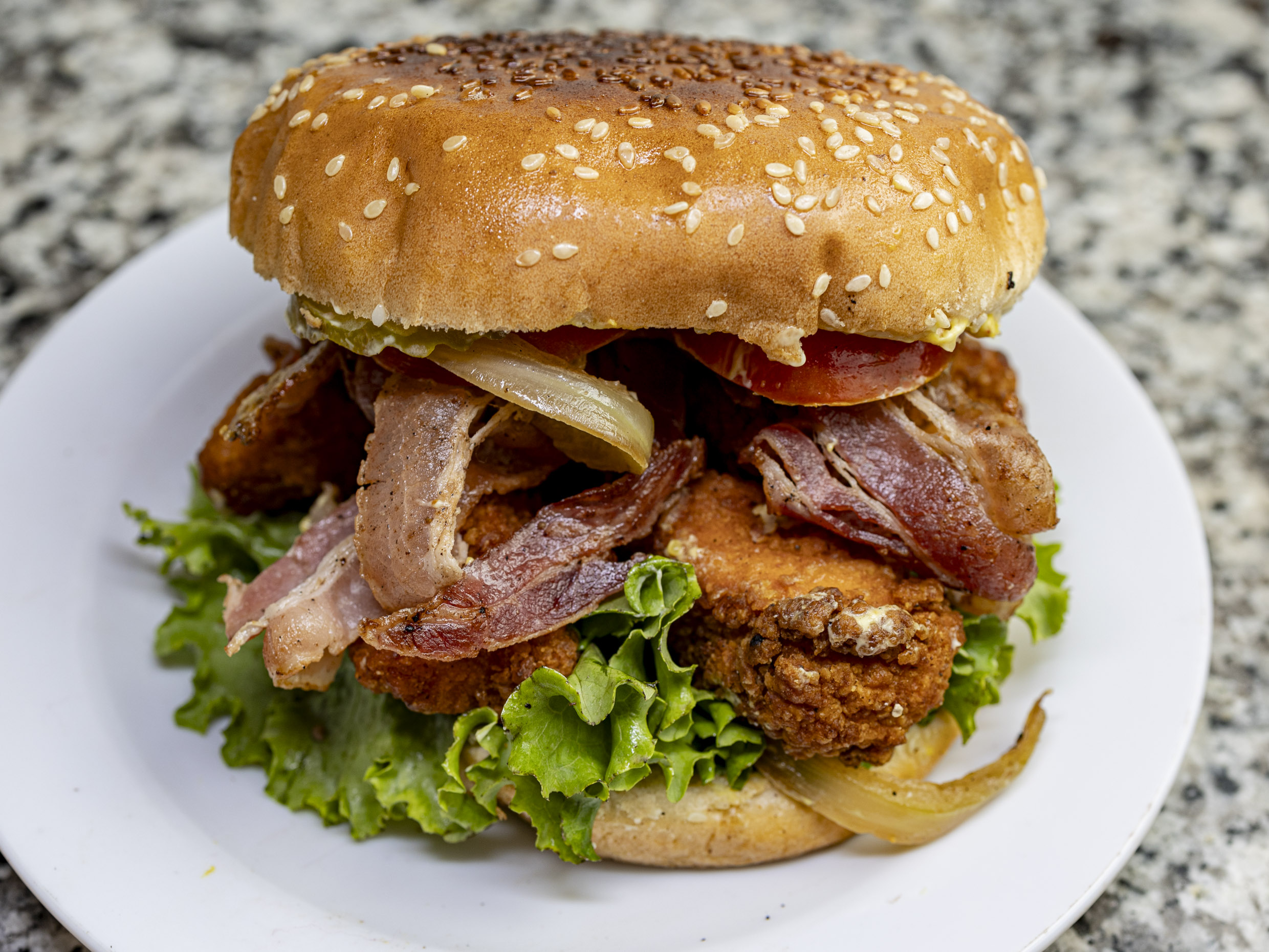 Hamburguesa de boneless con tocino, la salsa de los boneless de su preferencia, jitomate, pepinillos, cebolla, queso y aderezos.