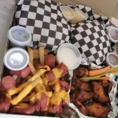Incluye: 1kg de alitas(Sabor que tu quieras) , dedos de queso, palomitas de pollo, costillas BBQ, salchipulpos, papas a la francesa, aros de cebolla, aderezo, chimichurri, catsup, vegetales y un refresco de 2 lt.