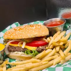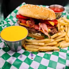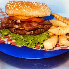 Carne casera al carbón, tocino, queso amarillo, pepinillos, lechuga, jitomate y cebolla (incluye papas a la francesa, cátsup y chimichurri).