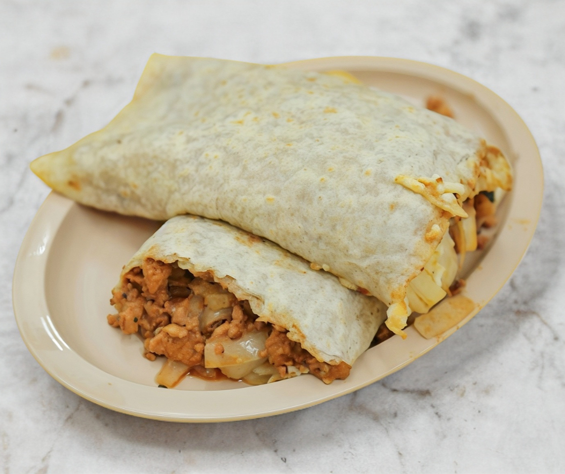 Tortilla de harina jumbo, chorizo, queso, frijol, cebolla.