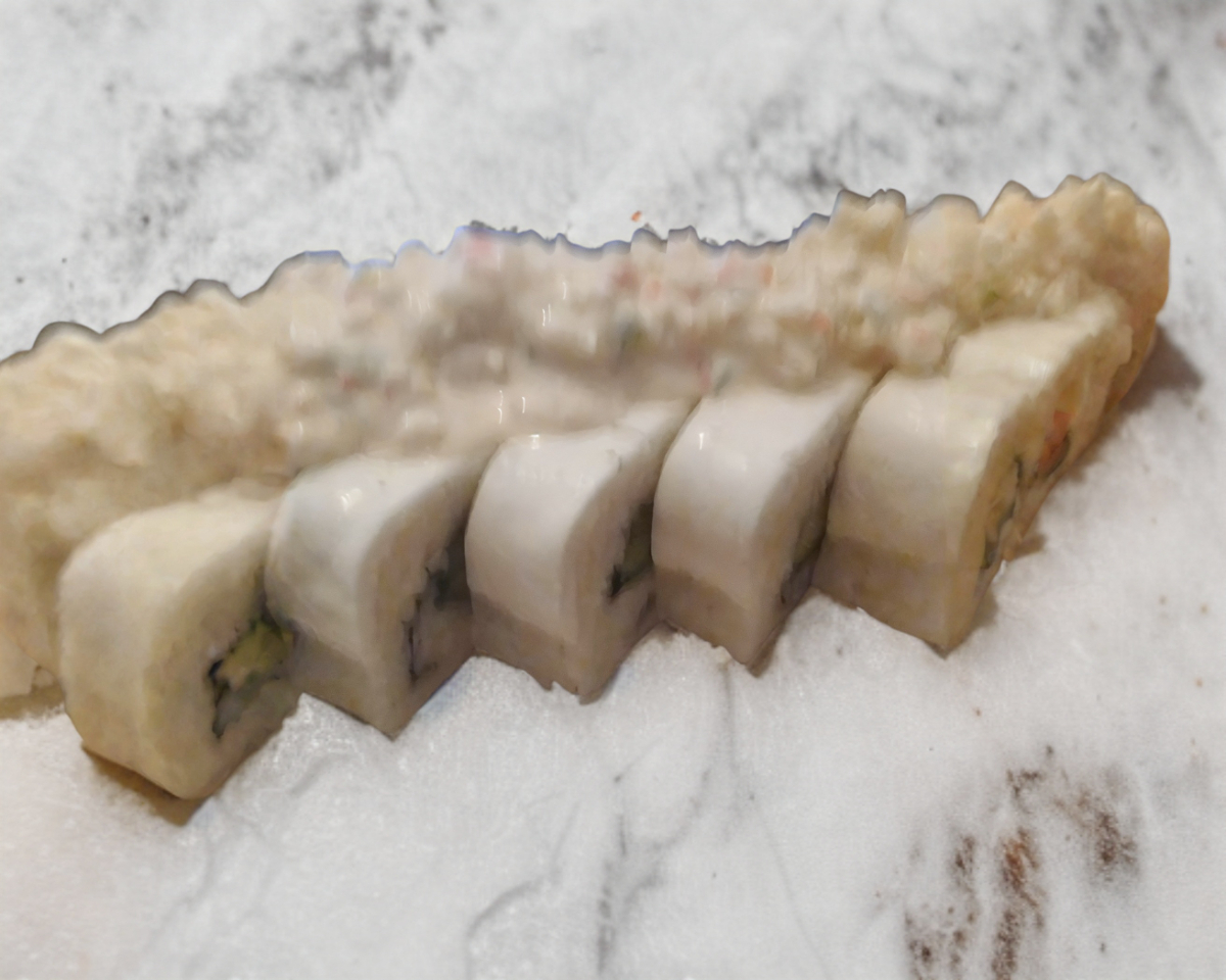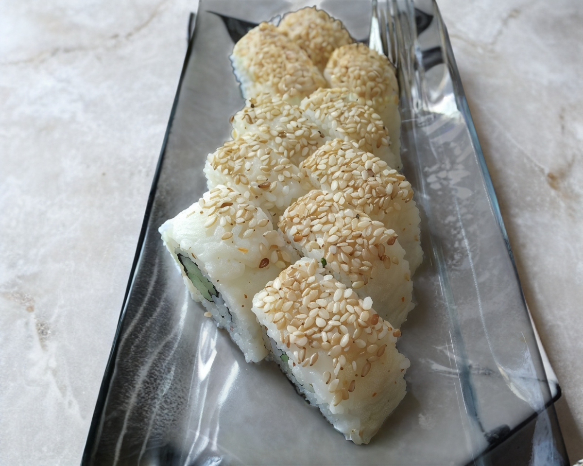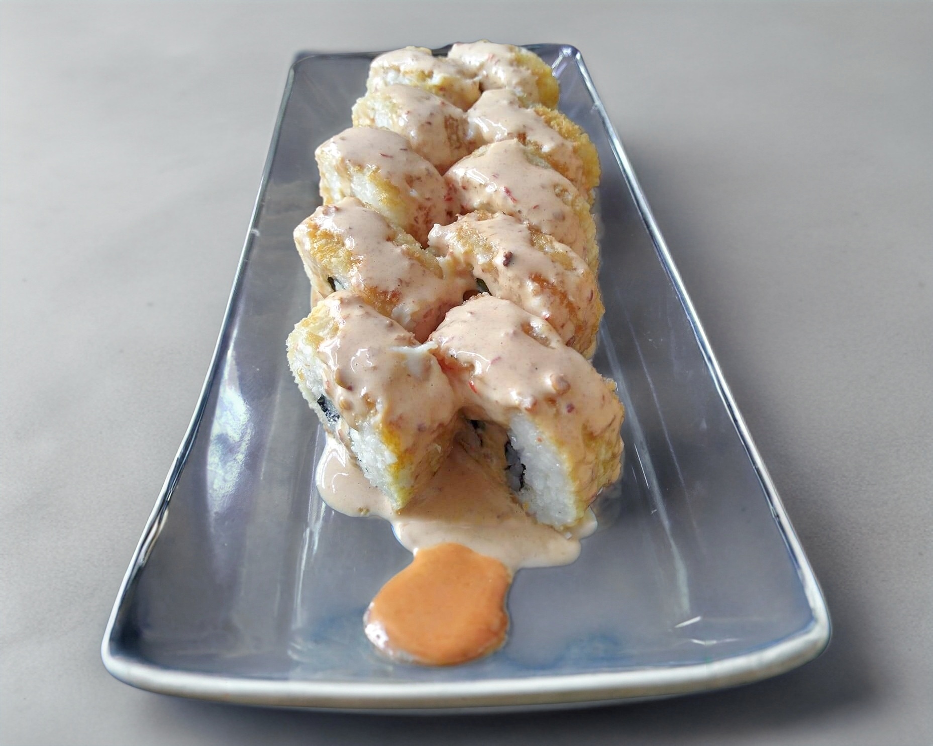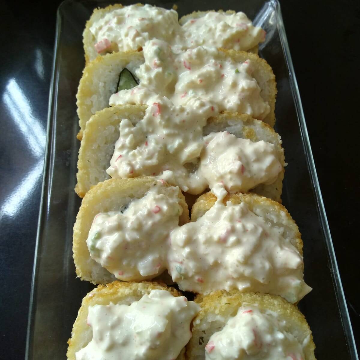 10 piezas Hot roll // Empanizado pepino queso phidadhelfia, aguacate cubierto de topping de tampico .