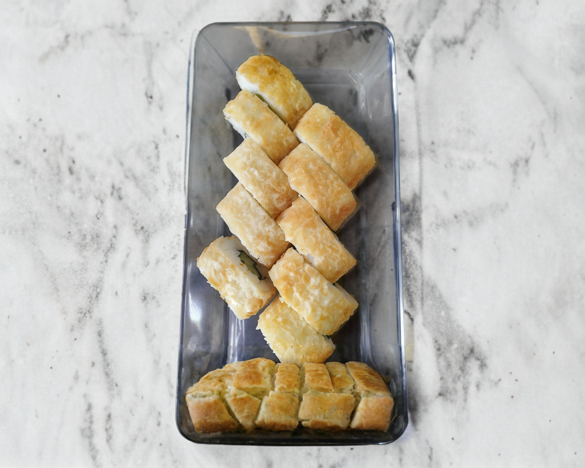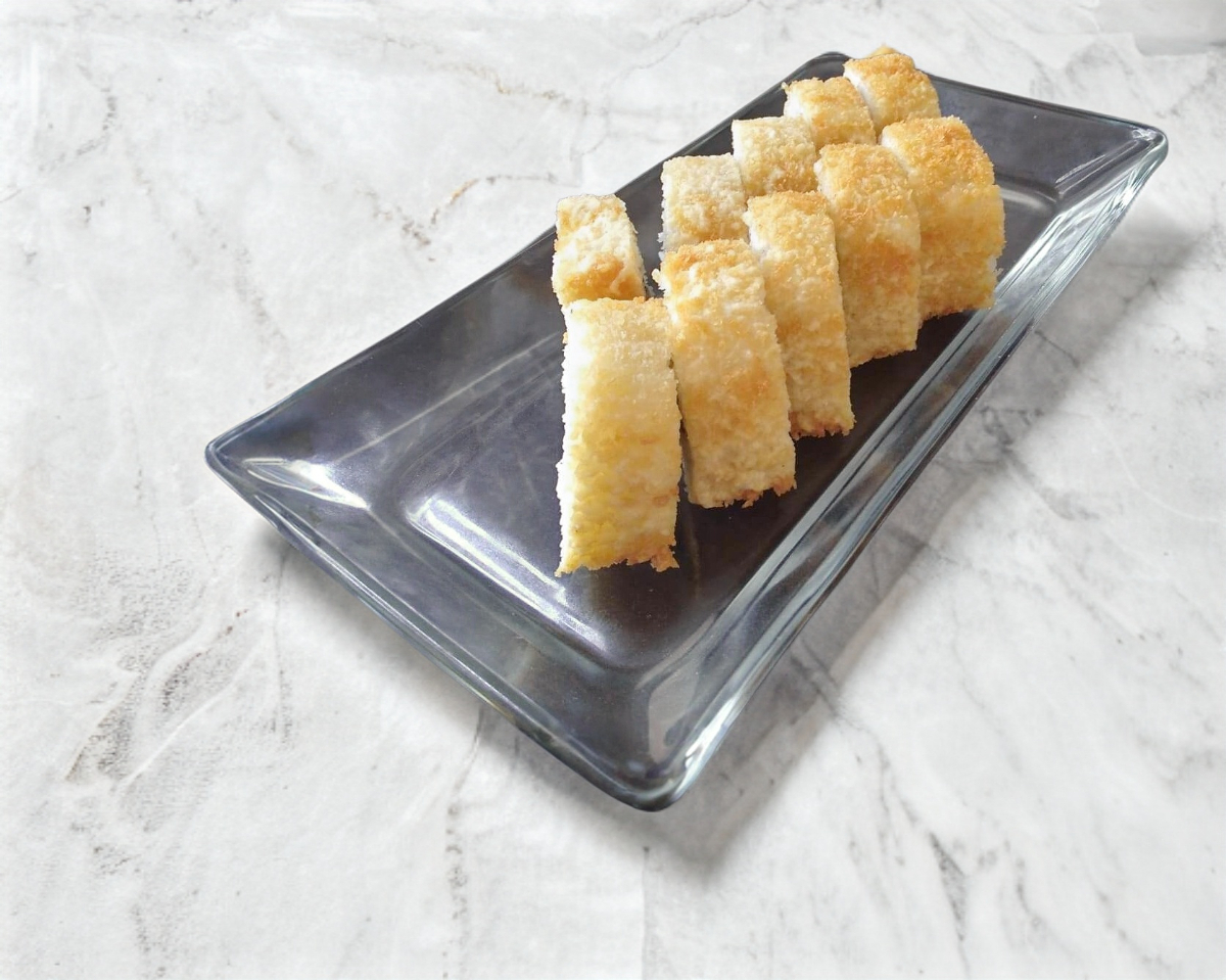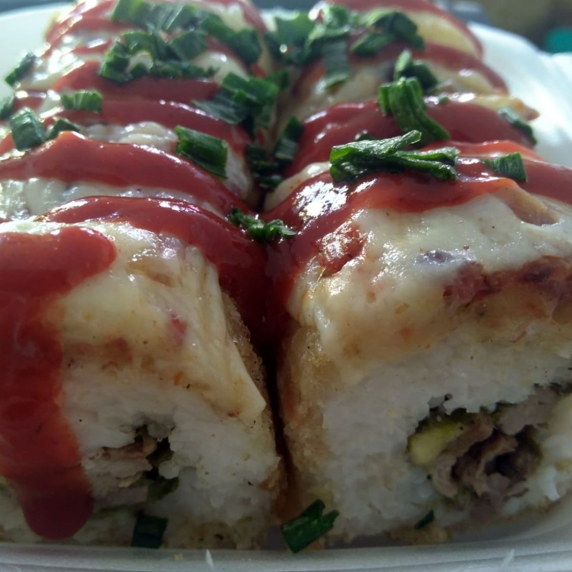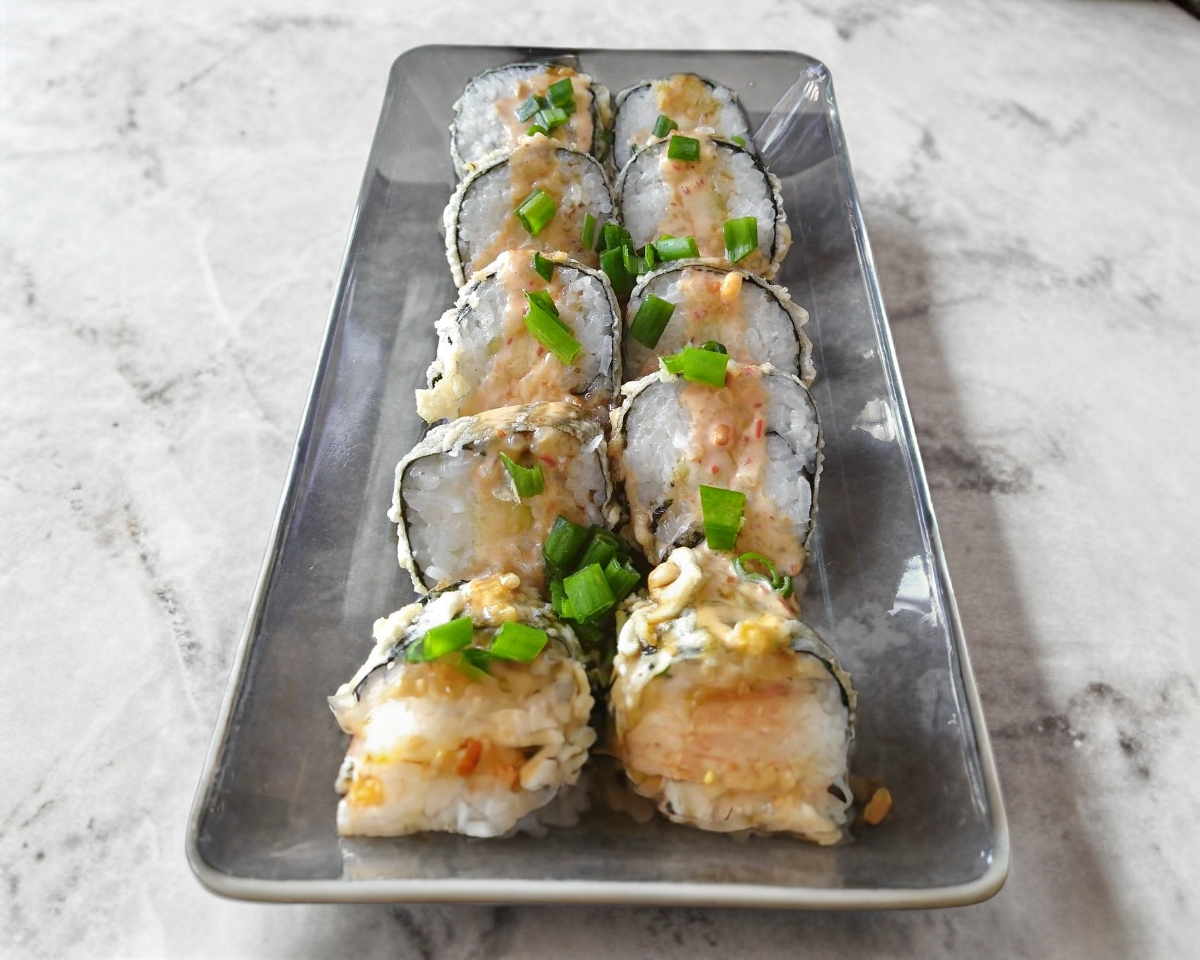 10 piezas Hot roll // Empanizado pepino queso phidadhelfia, aguacate cubierto de topping de tampico .